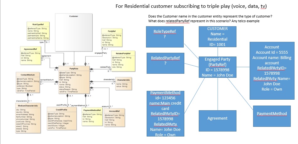 RelatedPartyRef to link back to the account manager, field installer, contractor, or simply members of the customers family. It falls back to what information you want to track.