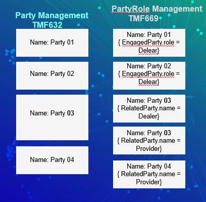 { "@type": "PartyRole", "href": "https:/host:port/tmf-api/partyRoleManagement/v4/partyRole/4079", "id": "4079", "name": "Global Pirates",// ??? I think as this is a role, so it should be a name to define a role, like provider or etc. "status": "Approved", "statusReason": "NDA has been signed", "validFor": { "startDateTime": "2018-06-16T00:00Z", "endDateTime": "2019-01-13T00:00Z" }, "engagedParty": { "@referredType": "Organization", "href": "https:/host:port/tmf-api/partyManagement/v2/organization/99", "id": "99", "name": "Global Pirates", "role": "Provider" },....
