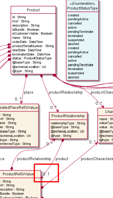 We are trying to model product inventory management API in accordance with TMF637. Our products are related, i.e. customers have "main offers" (Mobile subscription) and related add-ons (extra data in roaming, extra minutes, etc.). Product inventory resource model is built around the Product type as shown on the screenshot below. We assume that our "main offers" are in stances of the Product class; and the question is how to model add-ons correctly: