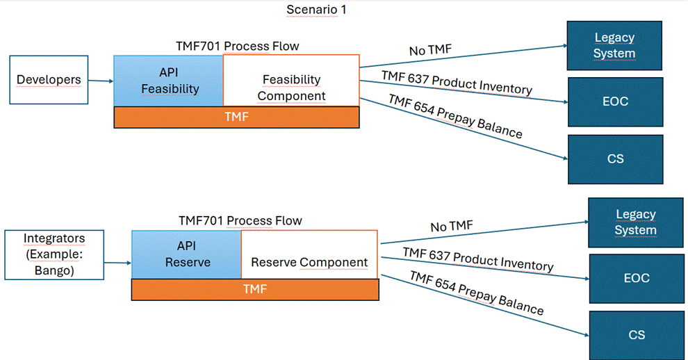 For scenario 1: Is it feasible for a developer, either internal (labeled as "developer" on the upper box) or external (labeled as "Integrators" on the lower box), to consume TMF APIs Considering that this would be for a Carrier billing-type flow.