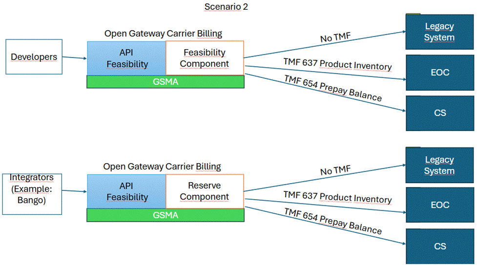 Question about scenario 3: A combined solution from scenario 1 and 2. That is, exposing GSMA APIs towards external integrators, while exposing TMF APIs towards internal developers. Is it recommended according to the architecture of TMFORUM? What would be the TMF recommendation for executing a Carrier billing-type flow (e.g an OTT purchase)?