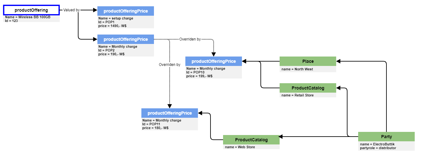 In your diagram you show a relationship between productOfferingPrice and ProductCatalog. We'll have to assume this means that you have a collection of catalogs"