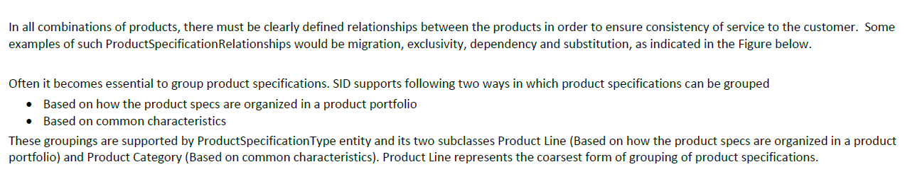 As for your second question, SID mentions that sometimes it's necessary to group product specifications. But honestly, I've never felt the need for it. We've never had enough ProdSpec to warrant grouping. And by the way, the product catalog API doesn't support it either. Instead, they group product offerings (not prodSpec) in "product categories."