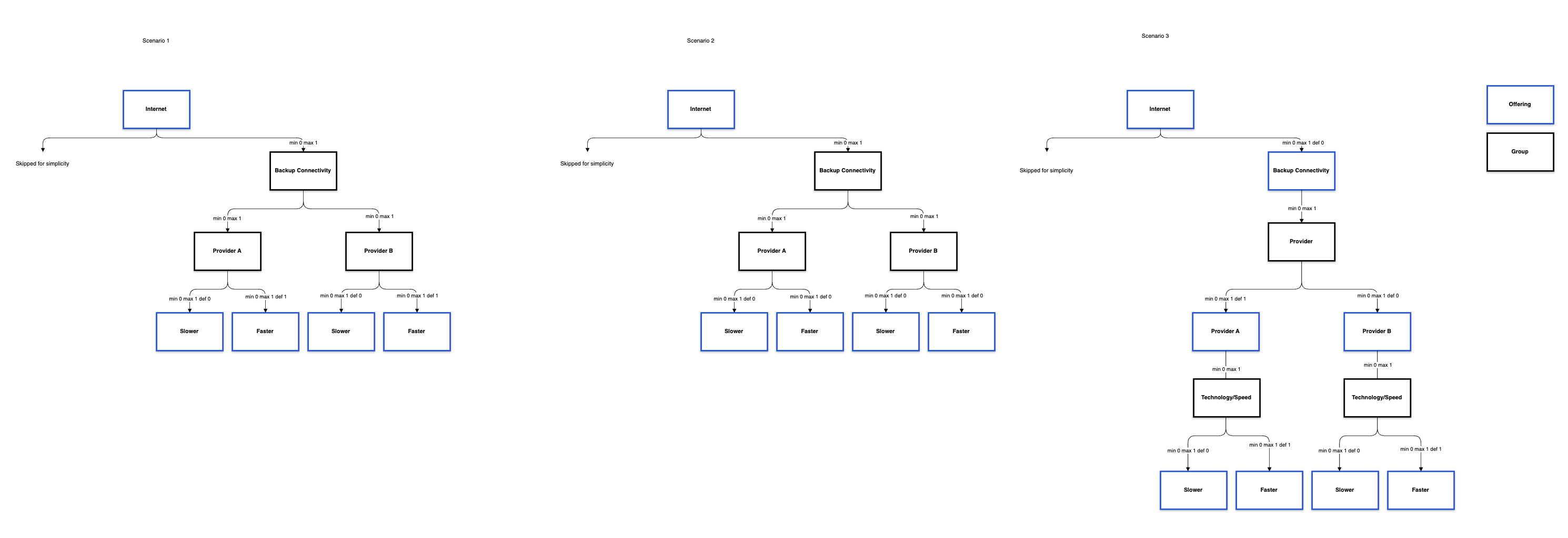 { "productOffering": { "@type": "ProductOffering", "id": "po-iptv", "bundledGroupProductOffering": [ { "@type": "BundledGroupProductOffering", "id": "grp-wifi-everywhere", "bundledProductOffering": [ { "id": "po-mesh-router", "bundledProductOfferingOption": { "min": 1, "max": 7, "default": 1 } // [group-level] BPO cardinalities for wifi router in this group }, { "id": "po-mesh-point", "bundledProductOfferingOption": { "min": 0, "max": 7, "default": 0 } // [group-level] BPO cardinalities for wifi point in this group } ], "bundledGroupProductOfferingOption": { "min": 1, "max": 7 } // [group-level] group cardinalities } ], "bundledProductOffering": [ { "id": "po-mesh-router", "bundledProductOfferingOption": { "min": 1, "max": 7, "default": 1 }. // [bundle-level] BPO cardinalities }, { "id": "po-mesh-point", "bundledProductOfferingOption": { "min": 0, "max": 7, "default": 0 } // [bundle-level] BPO cardinalities } ] }}