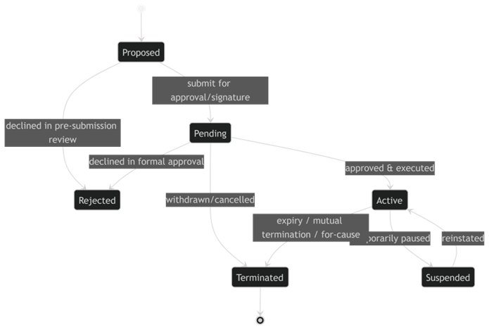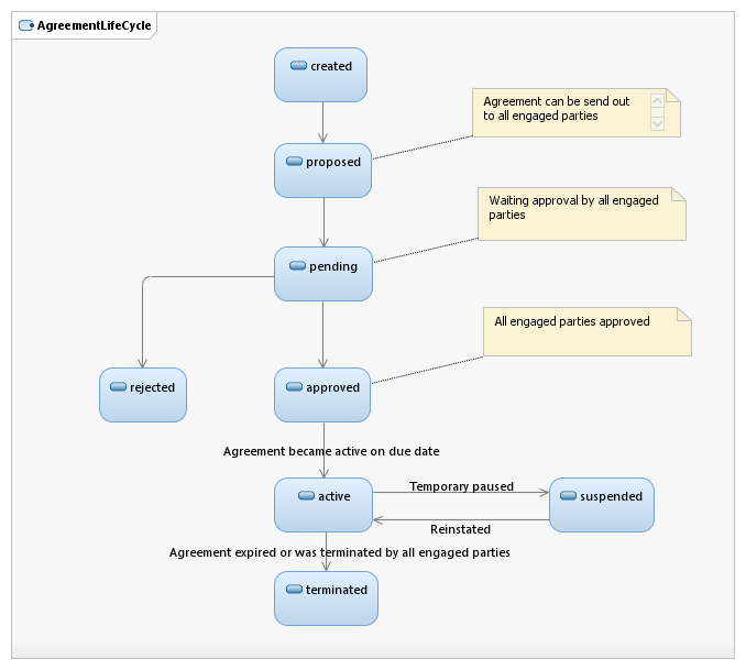 And the states will also depend on the Party roles. An agreement between Party role = Marketplace and Party role = Business Partner will have certain states. An Agreement between party role = Marketplace owner and party role = Customer will have different states.